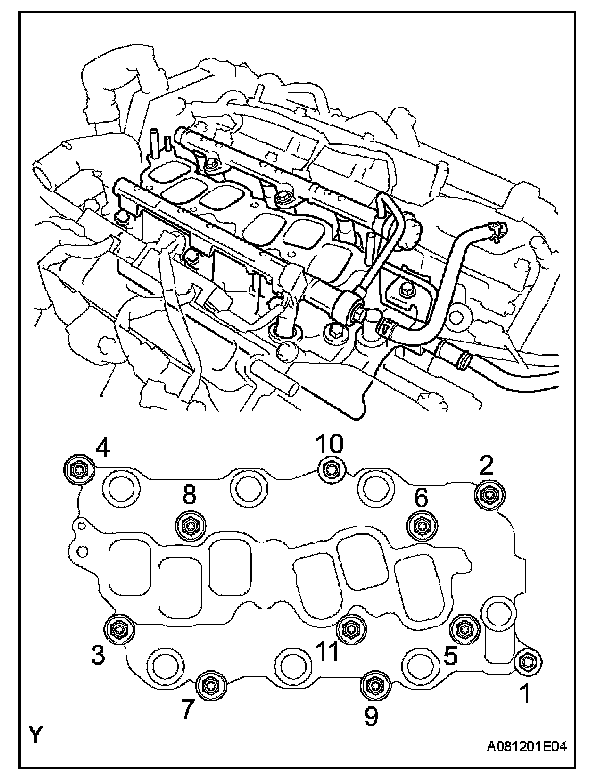 NOTE: Fully tightening one of these bolts or nuts without partially tightening the other bolts or nuts in the group may damage the intake manifold, bolts and nuts.