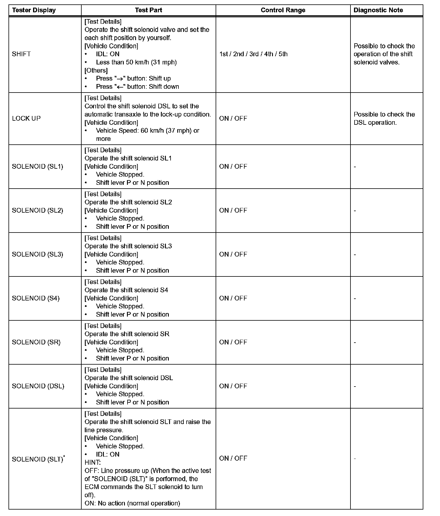 *: "SOLENOID (SLT)" in the ACTIVE TEST is performed to check the line pressure changes by connecting the SST to the automatic transaxle, which is used in the HYDRAULIC TEST as well.