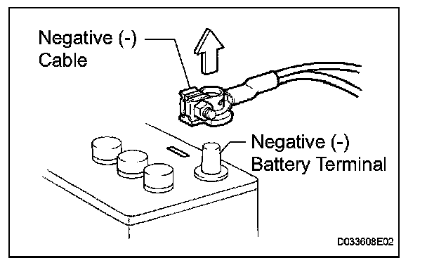 1. Before performing electronic work, disconnect the cable from the negative (-) battery terminal to prevent component and wire damage caused by accidental short circuits.