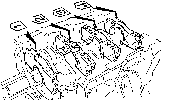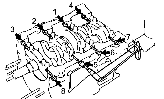 Uniformly install and tighten the 8 main bearing cap bolts in the sequence shown in the illustration.