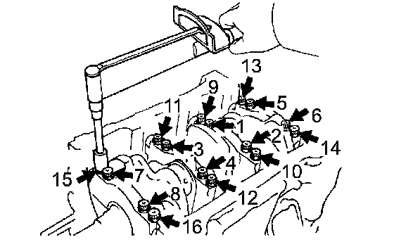 Uniformly install and tighten the 16 main bearing cap bolts in the sequence shown in the illustration.