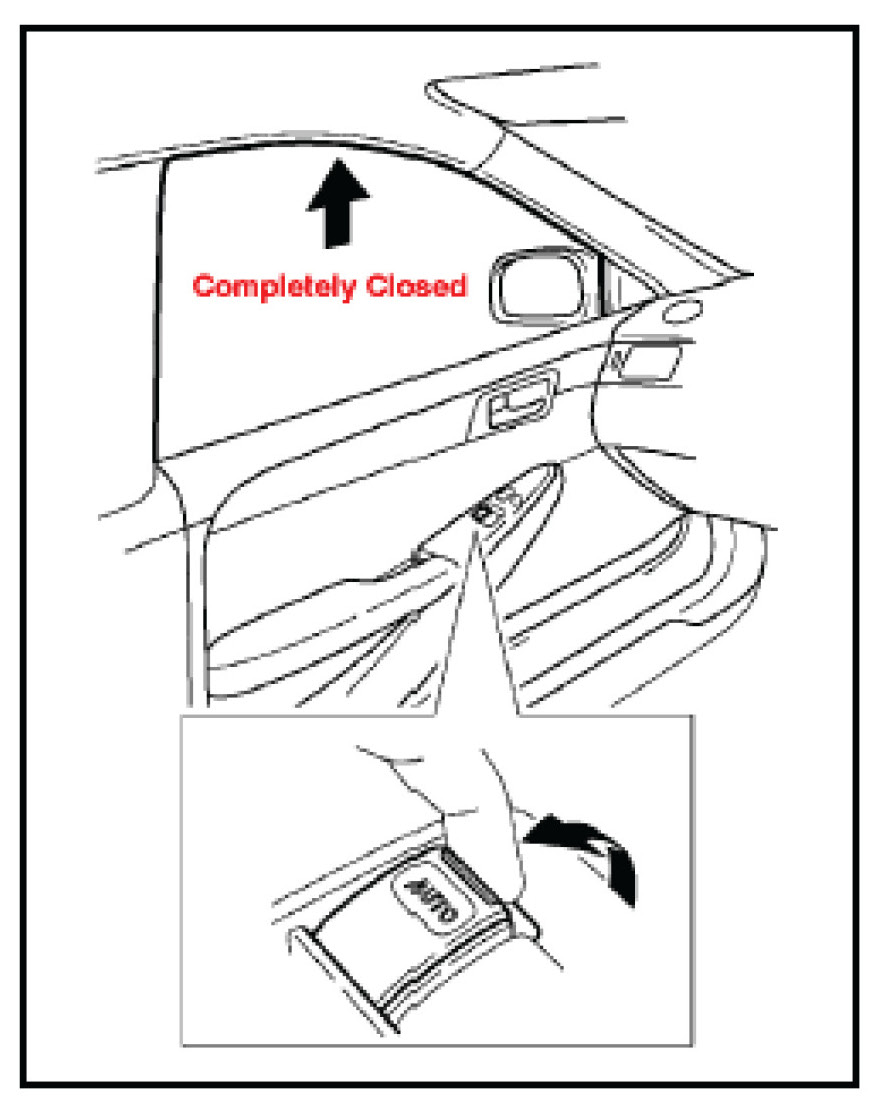 3. Pull and hold up the driver's door power window switch until the window closes. Continue holding the switch for approximately one second until the switch changes from blinking to a constant illumination.
