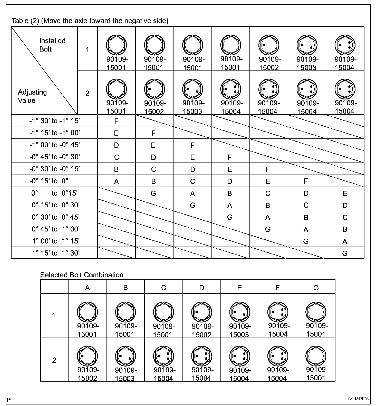 Check the combination of installed bolts. Select appropriate bolts from the table to adjust the camber to within the specified range.