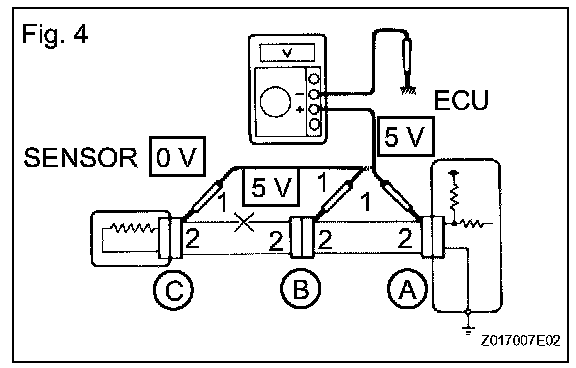 CHECK FOR OPEN CIRCUITa. For an open circuit in the wire harness in Fig. 1, check the resistance or voltage, as described.