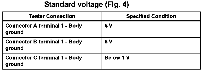 1. In a circuit in which voltage is applied to the ECU connector terminal, an open circuit can be checked by conducting a voltage check. With each connector still connected, measure the voltage between the body ground and these terminals (in this order): 1) terminal 1 of connector A, 2) terminal 1 of connector B, and 3) terminal 1 of connector C.