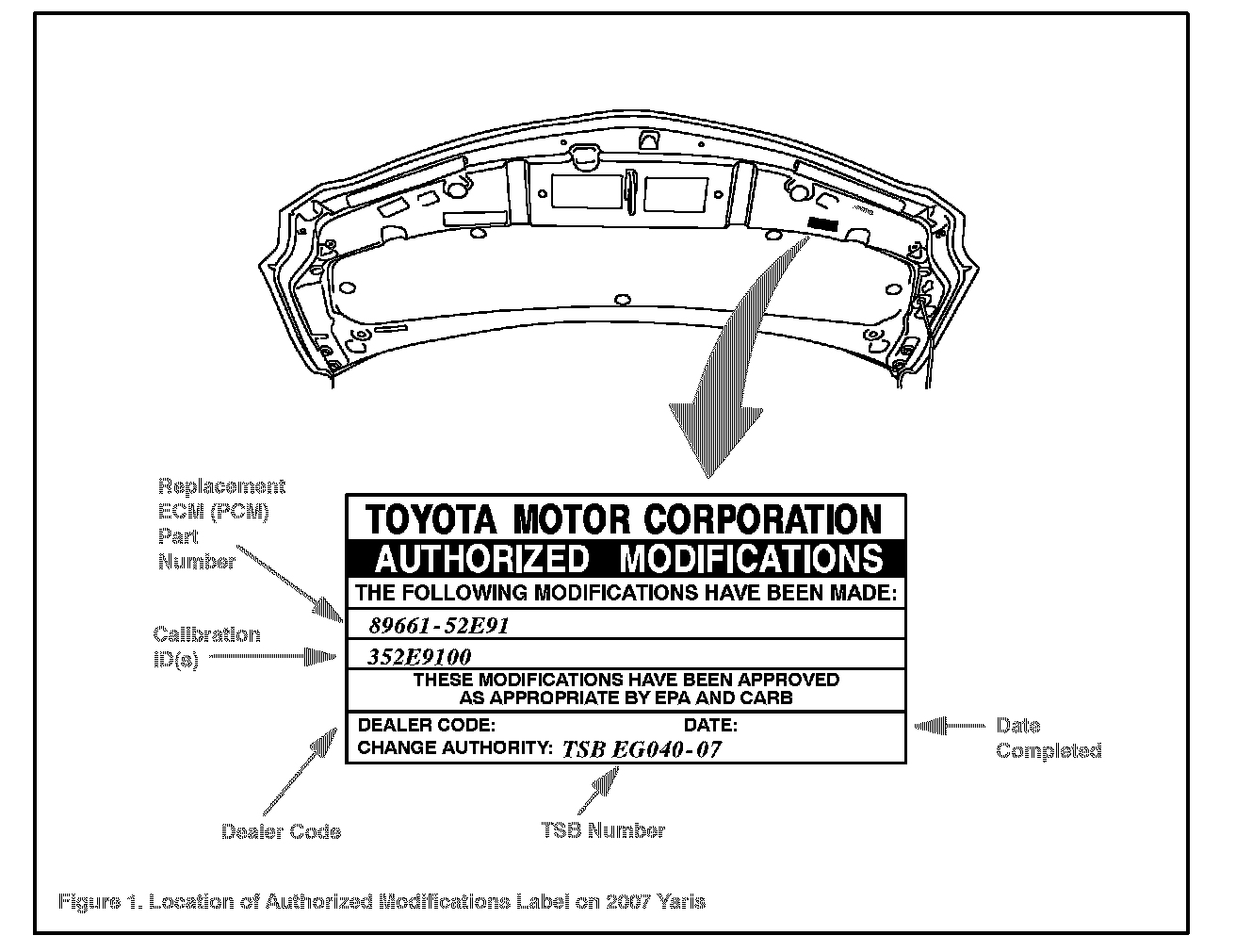 1. Check for the Authorized Modifications Label affixed to the vehicle in the location shown in Figure 1. Confirm if the ECM (PCM) calibration has been updated. If the calibration listed is NOT the latest ECM (PCM) calibration go to step 2.