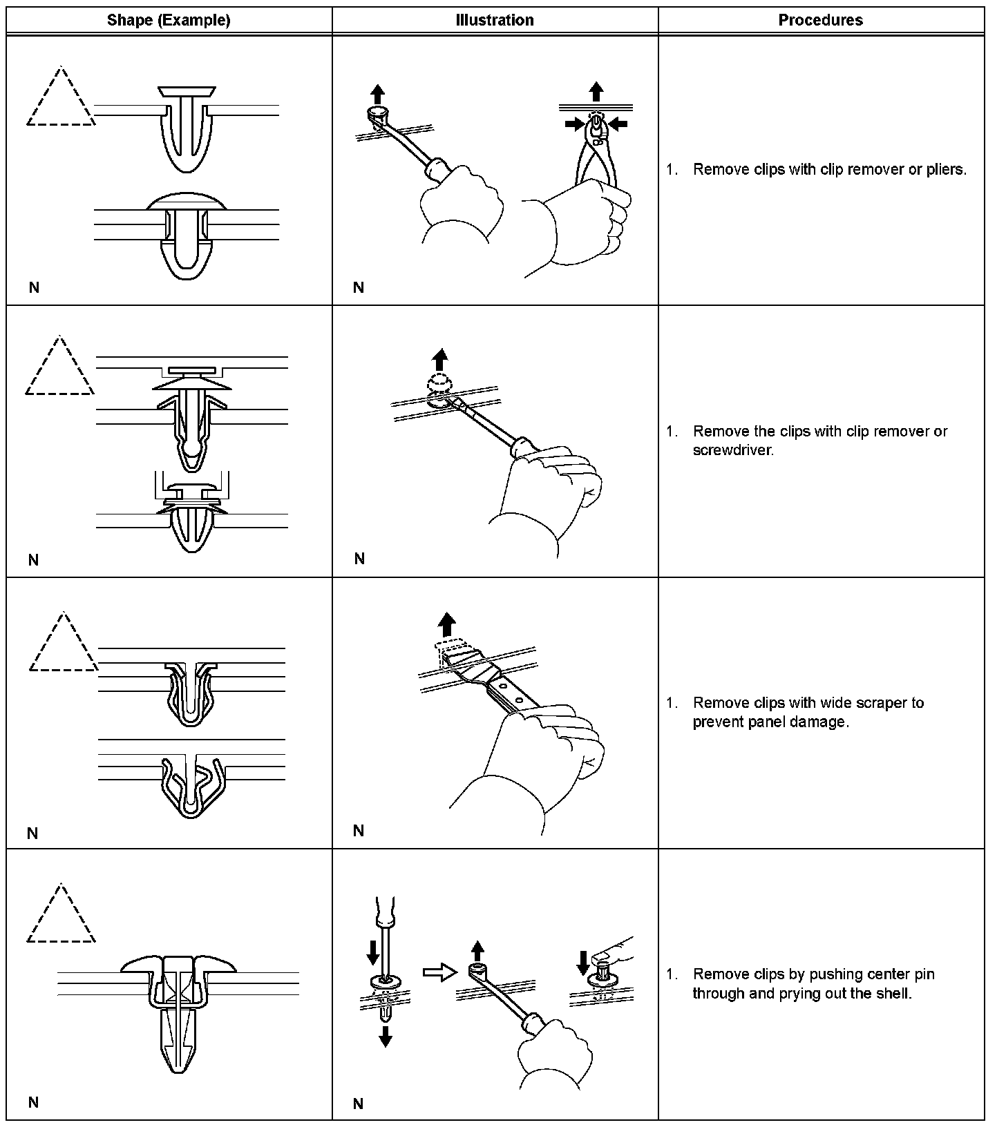 1. The removal and installation methods of typical clips used for vehicle body parts are shown in the table.