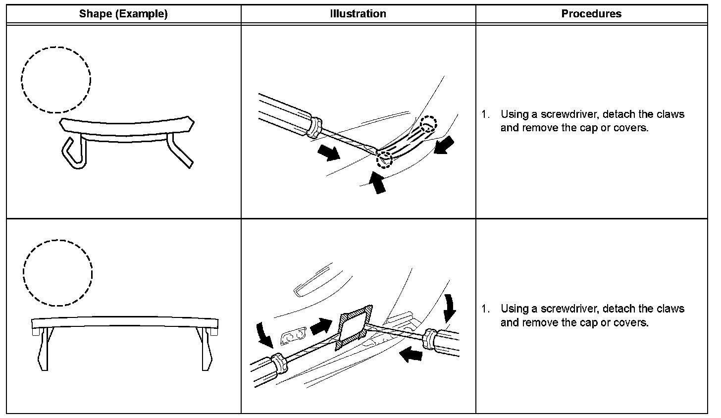 1. The removal and installation methods of typical claws used for vehicle body parts are shown in the table.