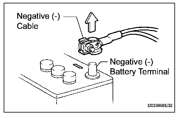 1. Before performing electronic work, disconnect the cable from the negative (-) battery terminal to prevent component and wire damage caused by accidental short circuits.