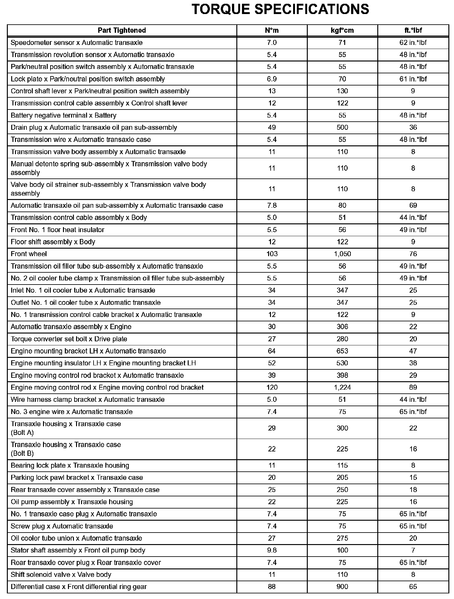 Automatic Transaxle - Torque Specifications: