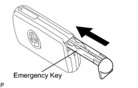 (a) Push and hold the release knob in the direction indicated by the arrow in the illustration. Take the emergency key out of the transmitter case.
