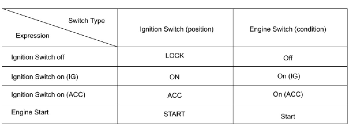 The type of ignition switch used on this model differs according to the specifications of the vehicle. The expressions listed in the table below are used.