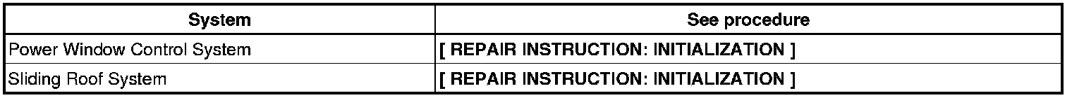 - When disconnecting the negative (-) battery cable, initialize the following systems after the cable is reconnected.