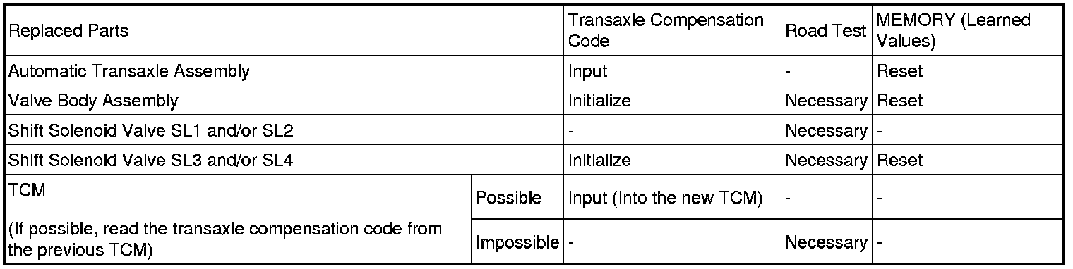 - If the automatic transaxle parts are replaced, perform the following as necessary referring to the table below: