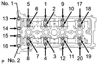- Using several steps, uniformly tighten the 20 bearing cap bolts in the sequence shown in the illustration.
