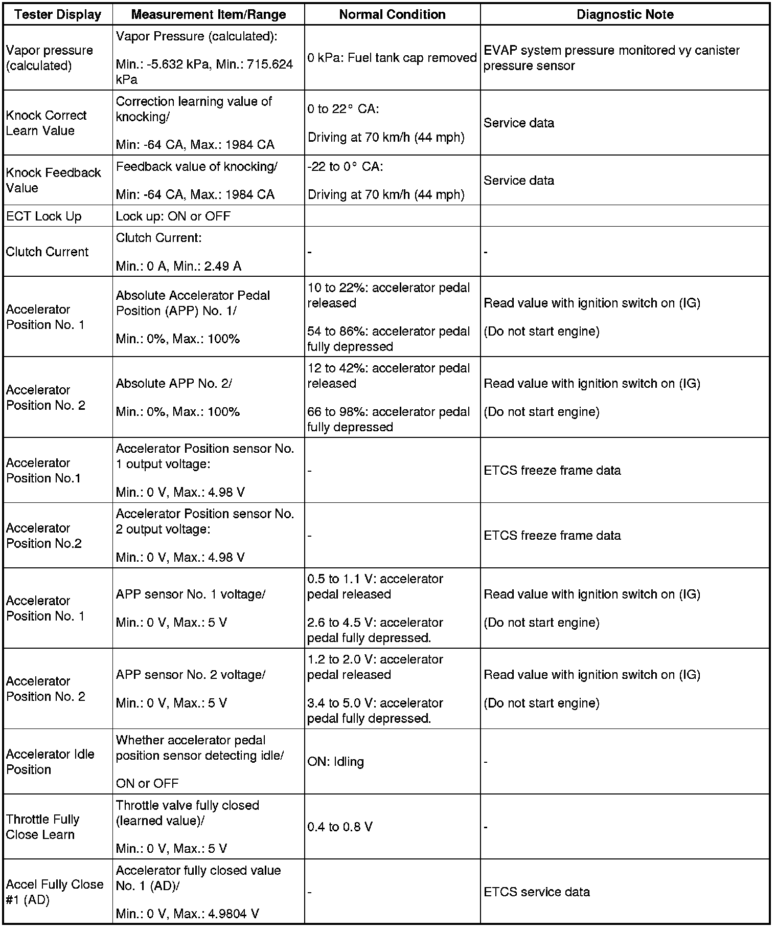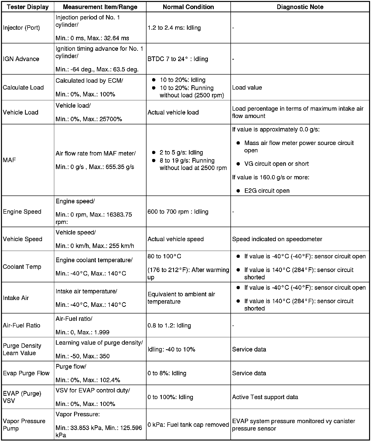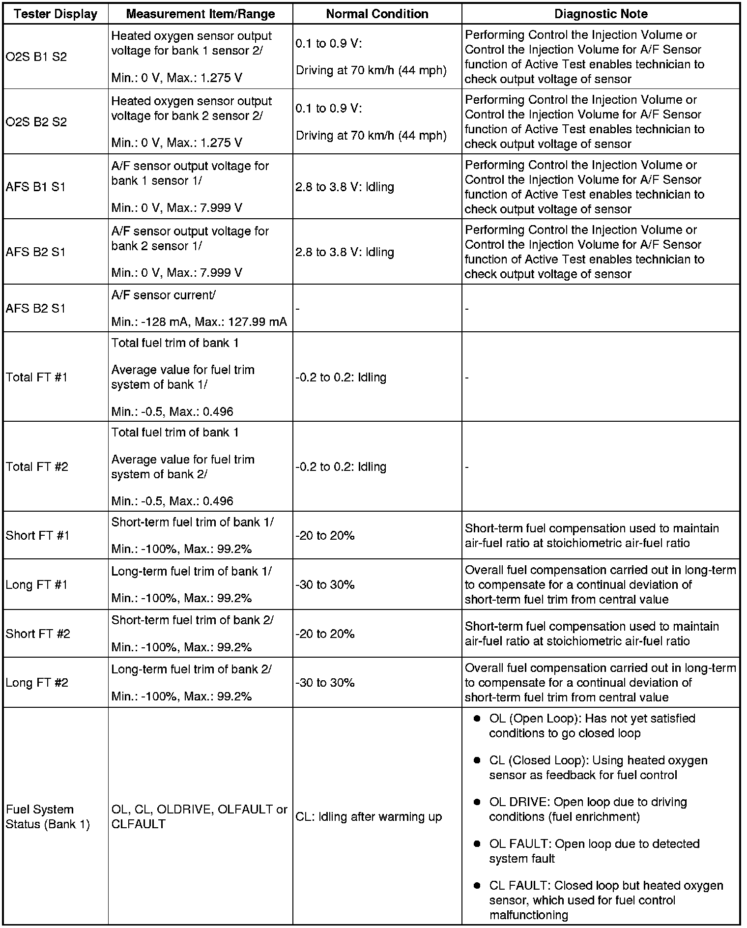 NOTE: In the table below, the values listed under Normal Condition are reference only. Do not depend solely on these values when determining whether or not a part is faulty.