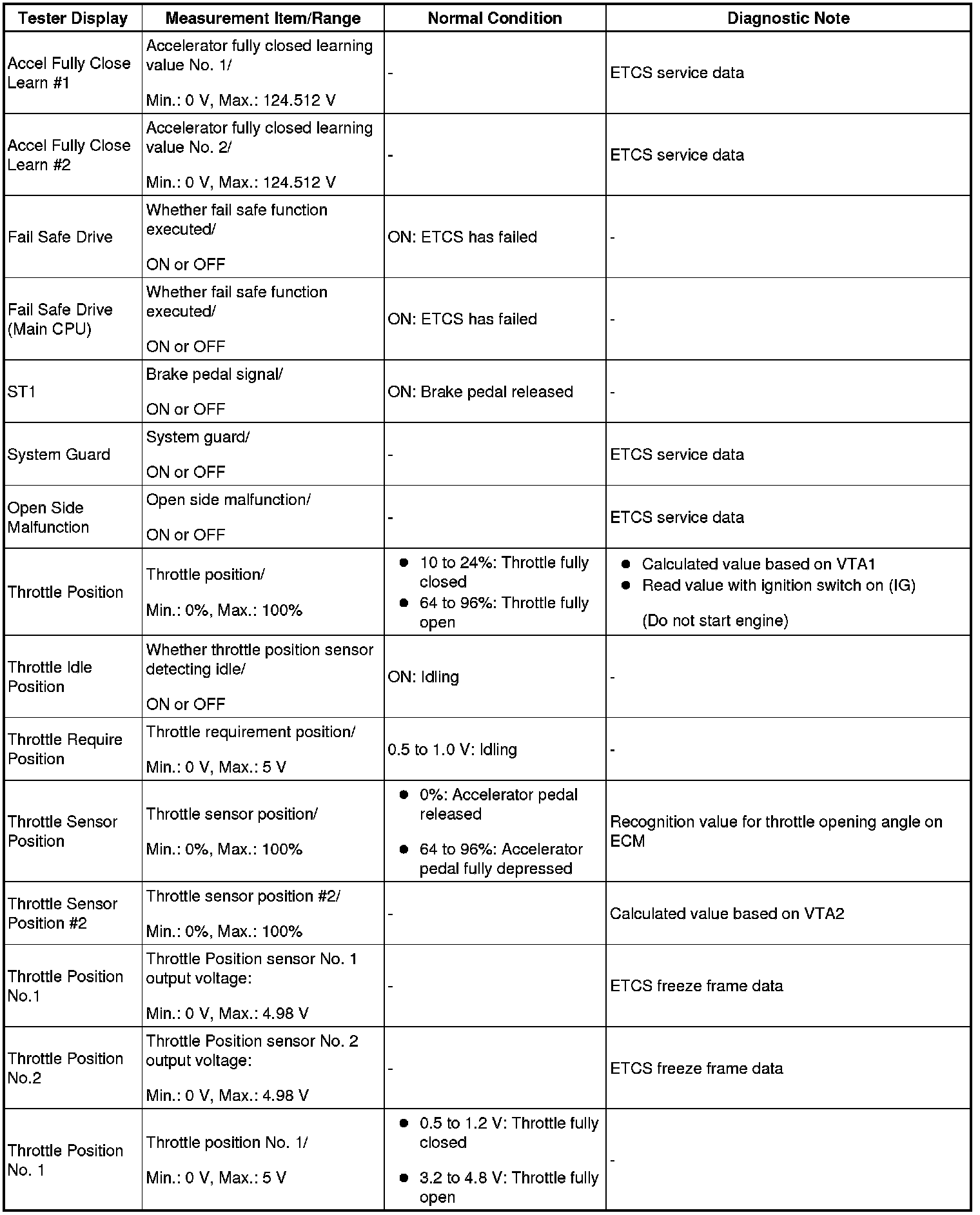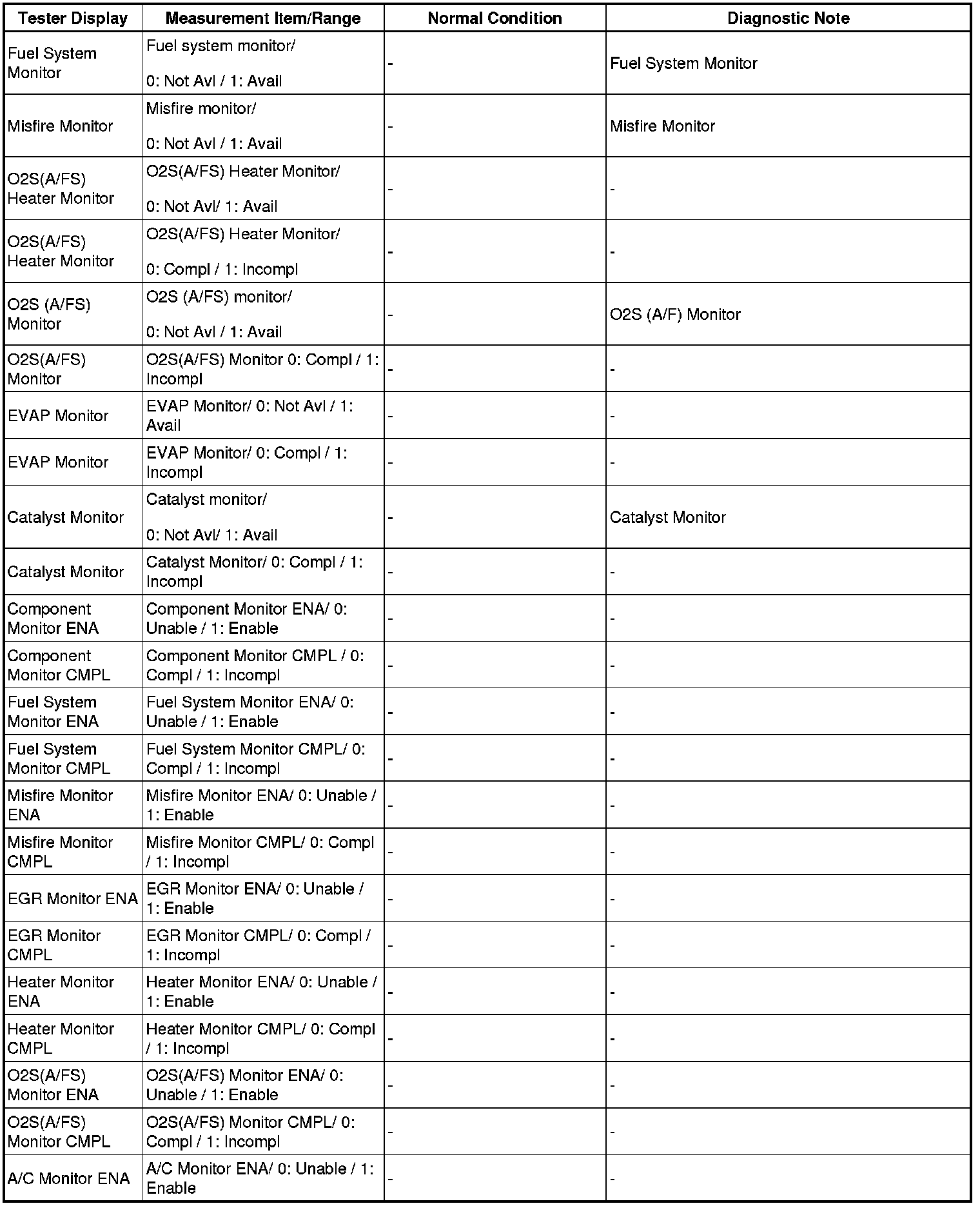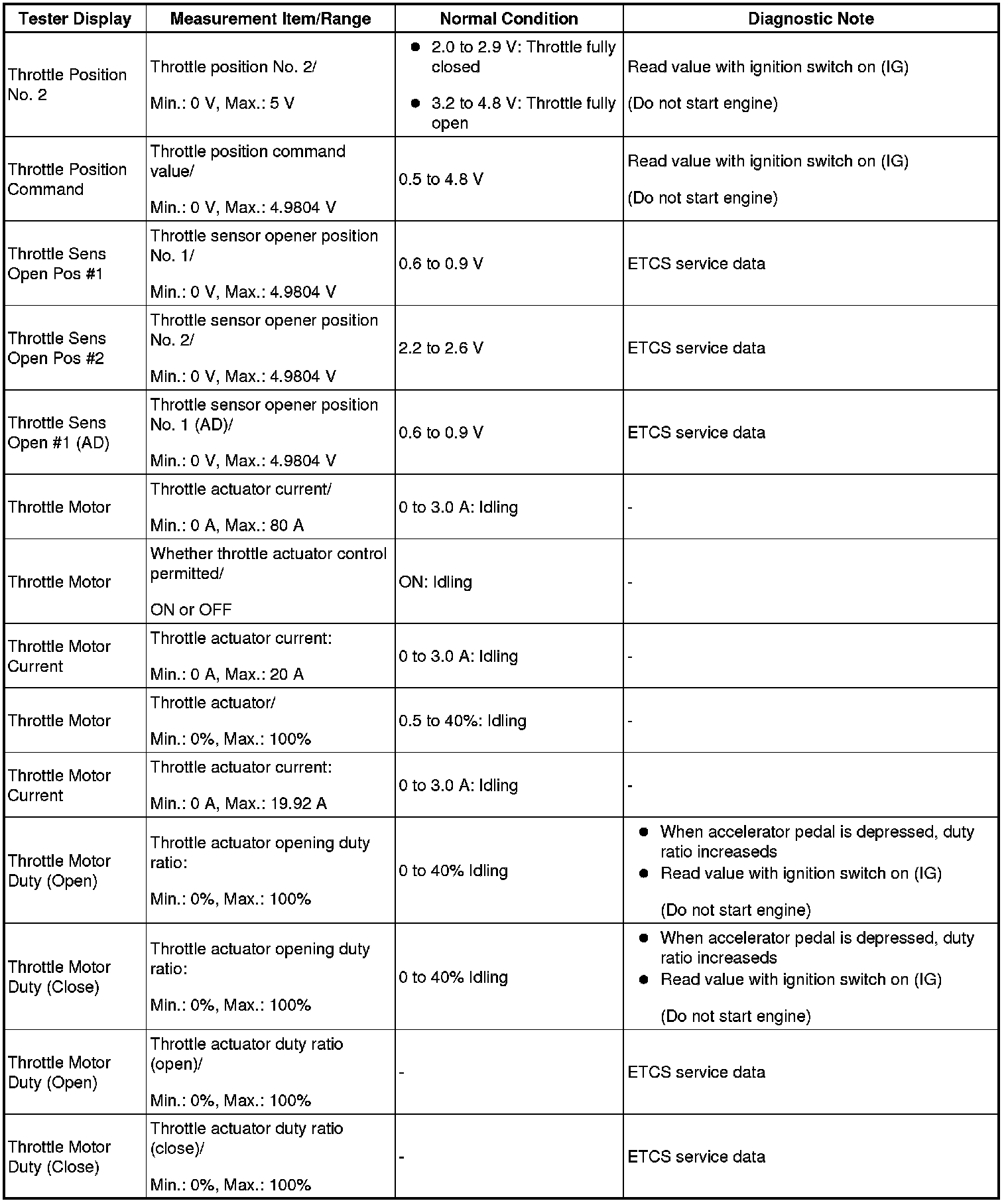 NOTE: In the table below, the values listed under Normal Condition are reference only. Do not depend solely on these values when determining whether or not a part is faulty.
