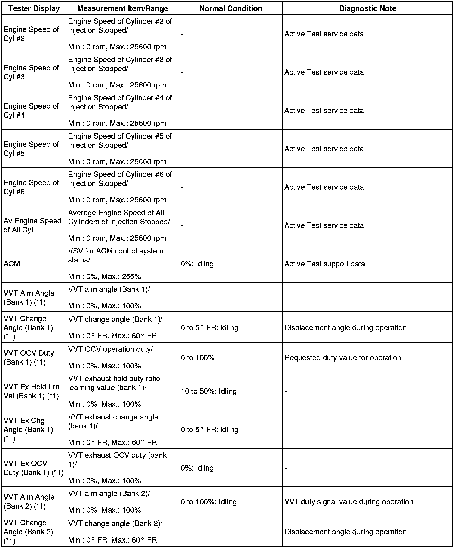 - *1: Data List values are displayed only when performing the following Active Test: Control the VVT Linear (Bank 1 or Bank 2) or Control the VVT Exhaust Linear (Bank 1 or Bank 2). For other Active Test, the Data List value will be 0.