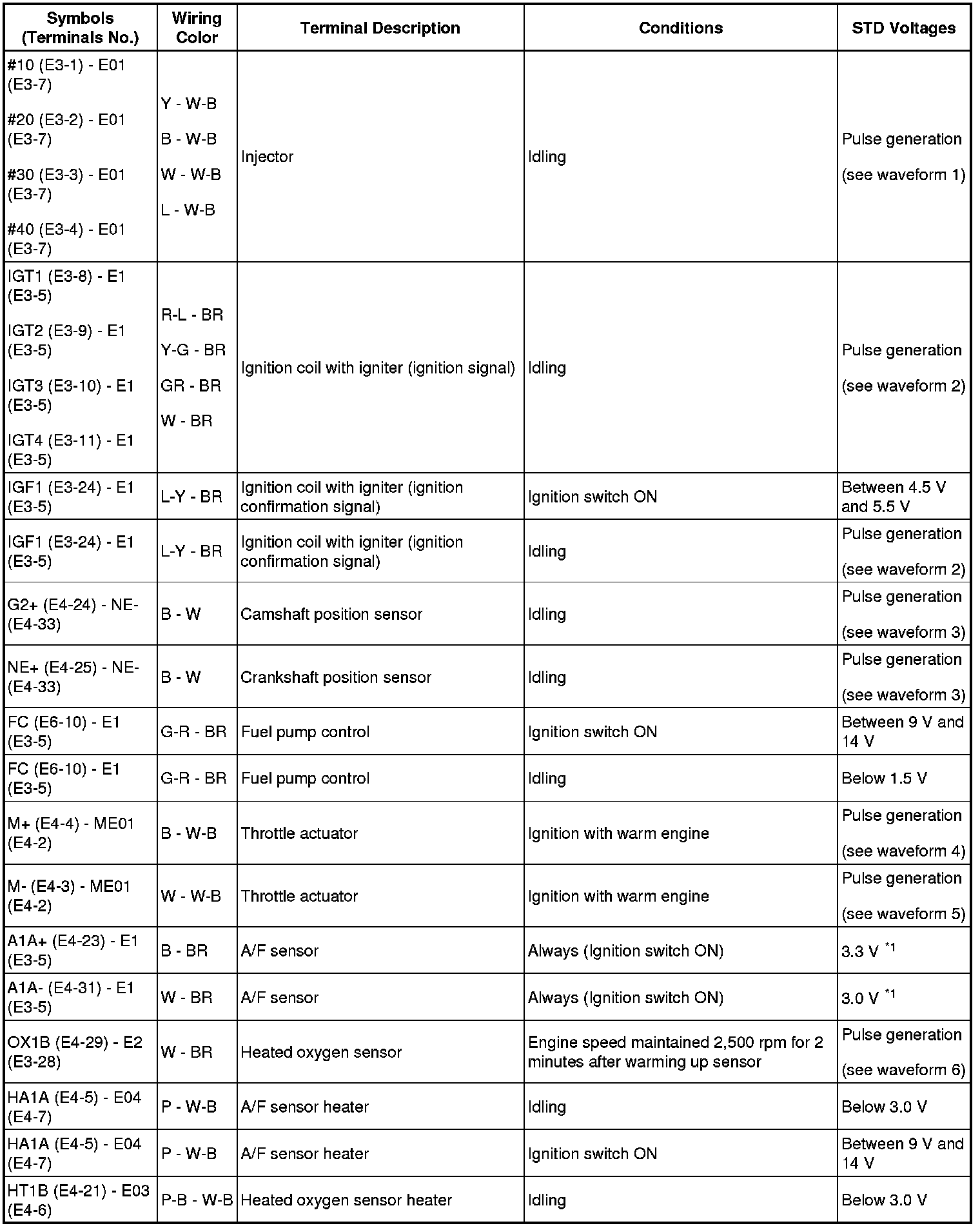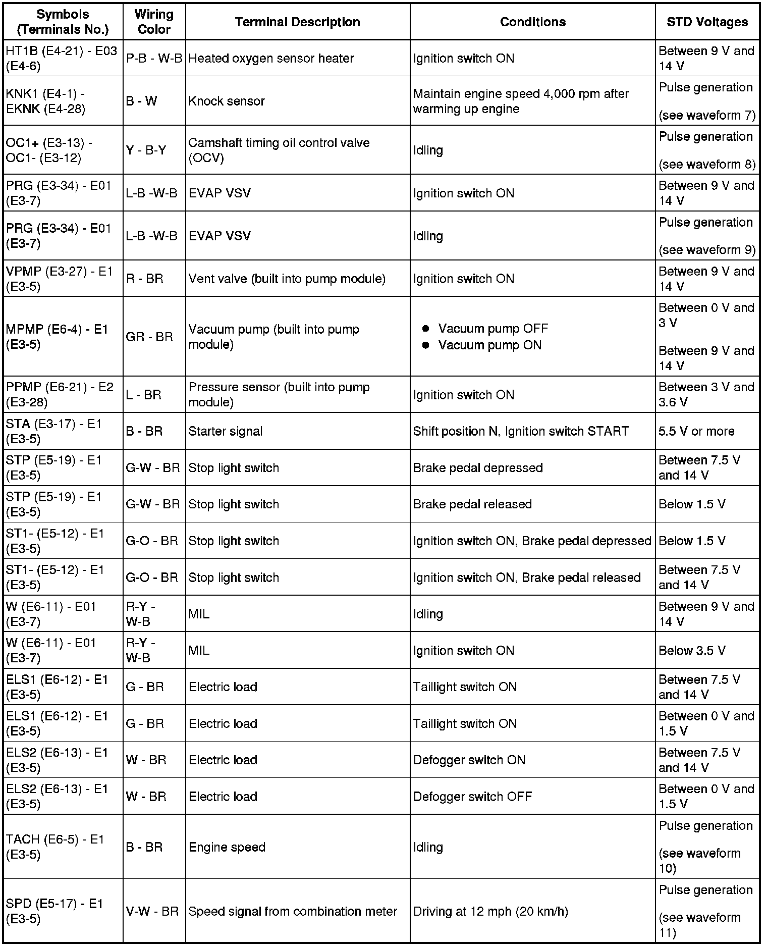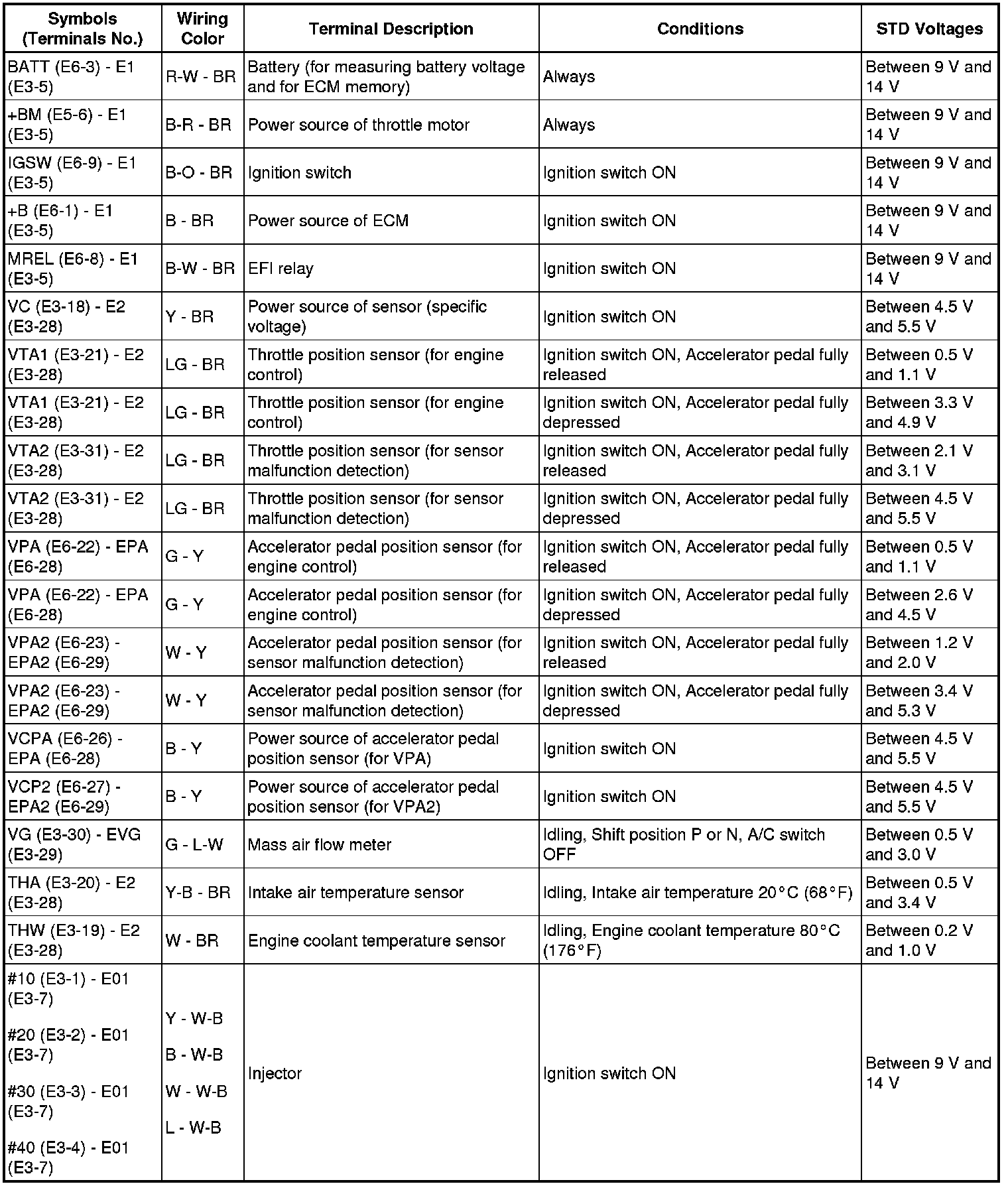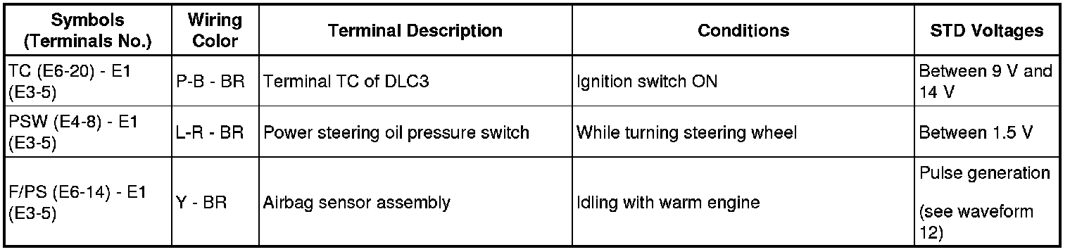 HINT: The standard voltage between each pair of ECM terminals is shown in the table below. The appropriate conditions for checking each pair of terminals are also indicated.