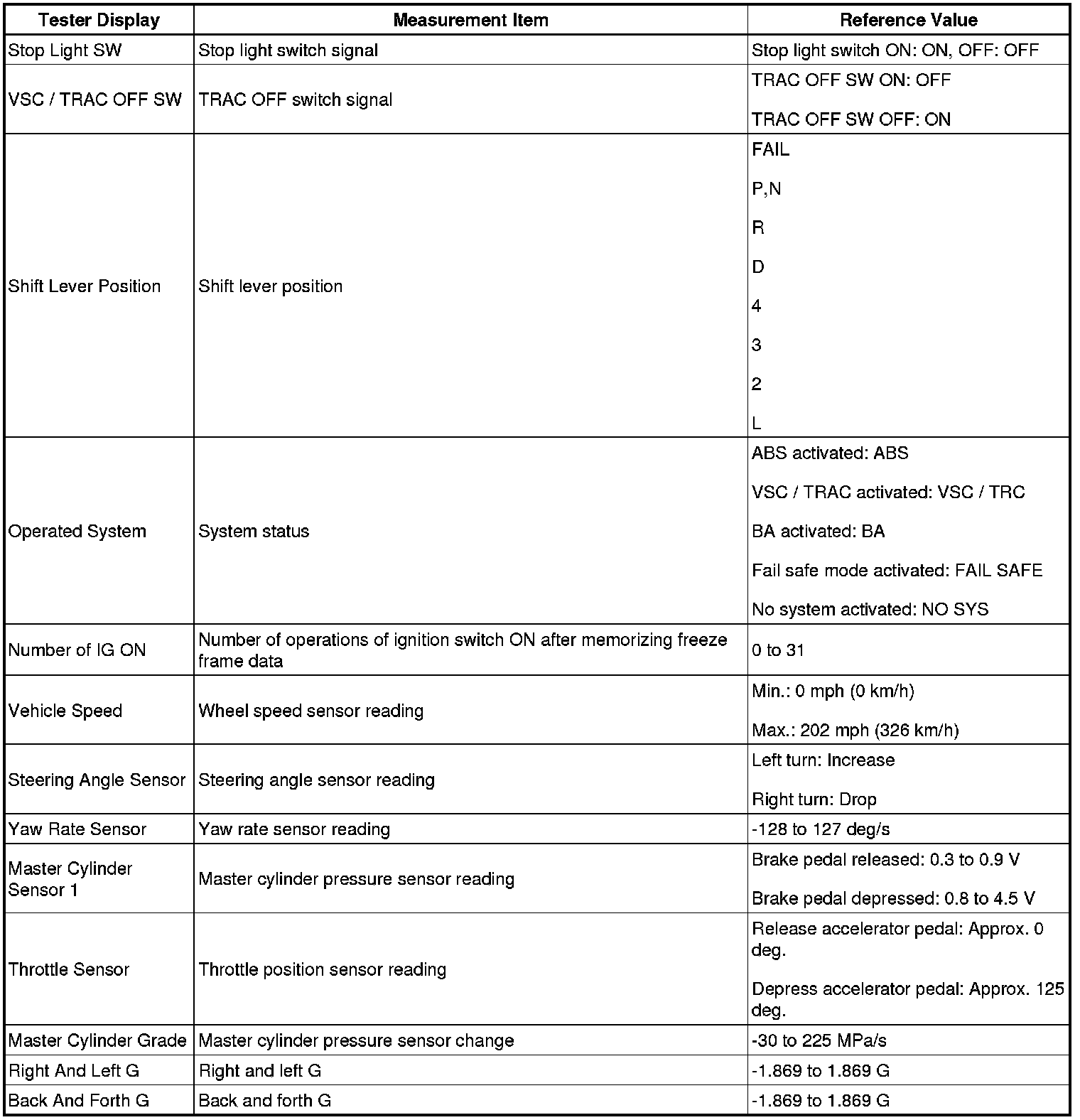 - Freeze frame data at the time the ABS operates: