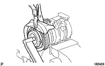 (d) Using a snap ring expander, install the magnetic clutch rotor and a new snap ring with the chamfered side facing up.