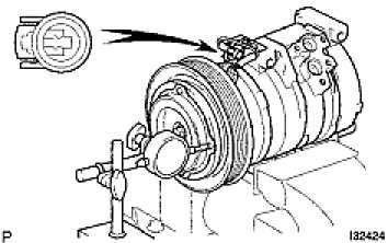 (b) Connect the battery positive lead to the terminal 1 of the magnetic clutch connector and the negative lead to the earth wire. Turn on and off the magnetic clutch and measure the clearance.