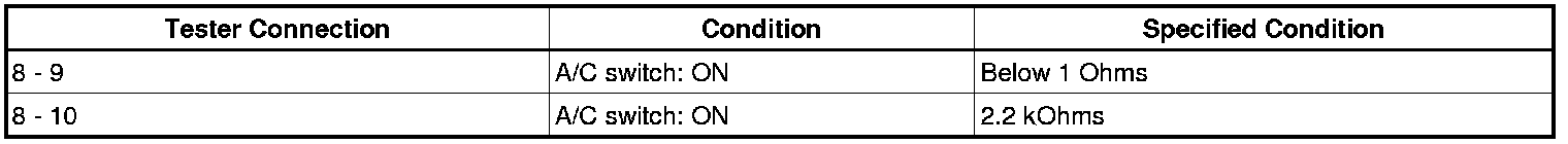 (1) Connect the positive (+) lead from the battery to terminal 8 and the negative (-) lead to terminal 10 while the A/C switch is pressed, then check that the illuminations light up.