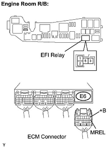 When the ignition switch is turned to the ON position, the battery voltage is applied to terminal IGSW of the ECM. The ECM MREL output signal causes a current to flow to the coil, closing the contacts of the EFI relay and supplying power to terminal +B of the ECM.