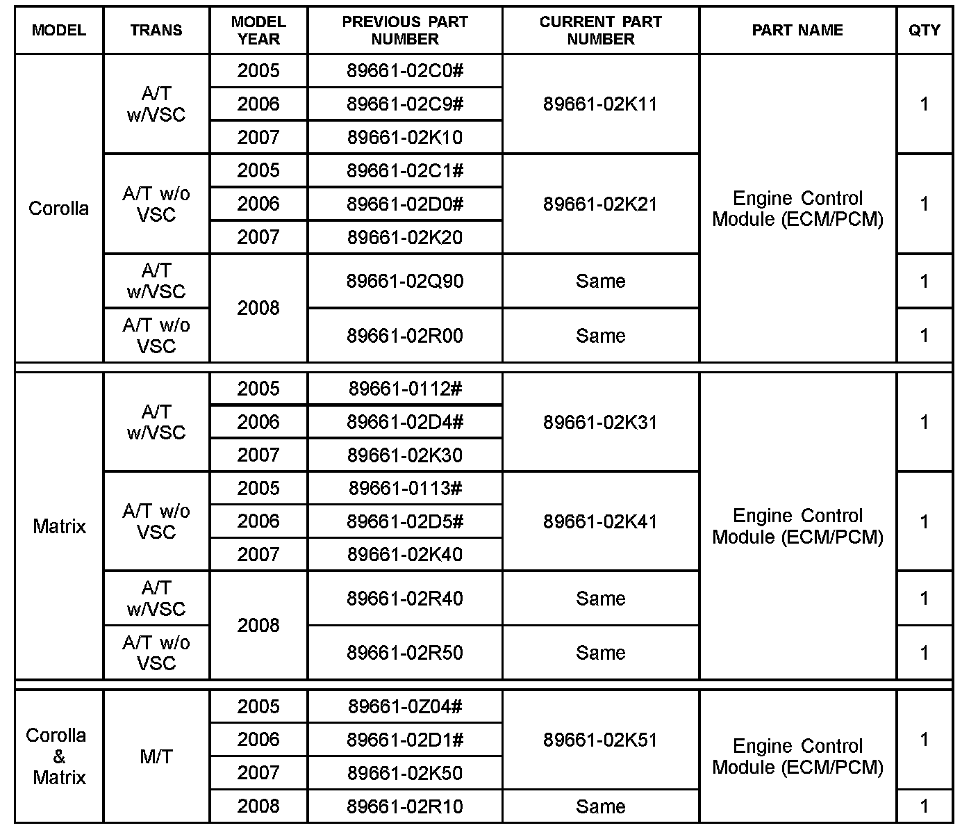 2005 - 2007 model year Corolla/Matrix vehicles are NOT compatible with 2008 model year ECMs.