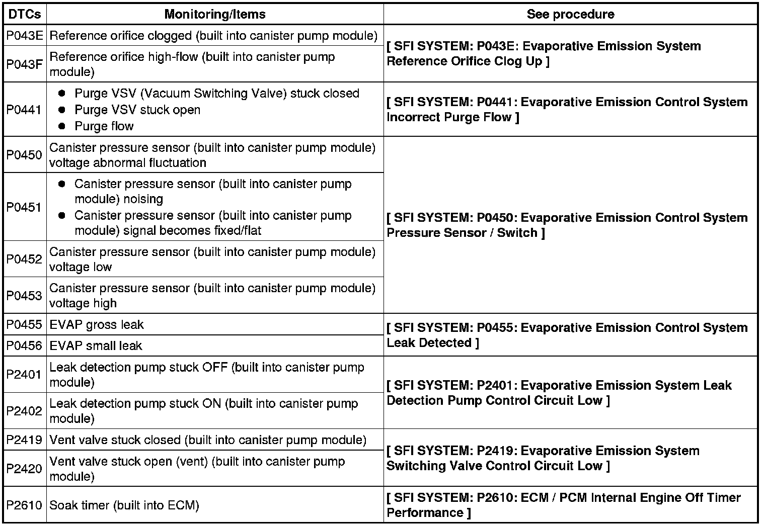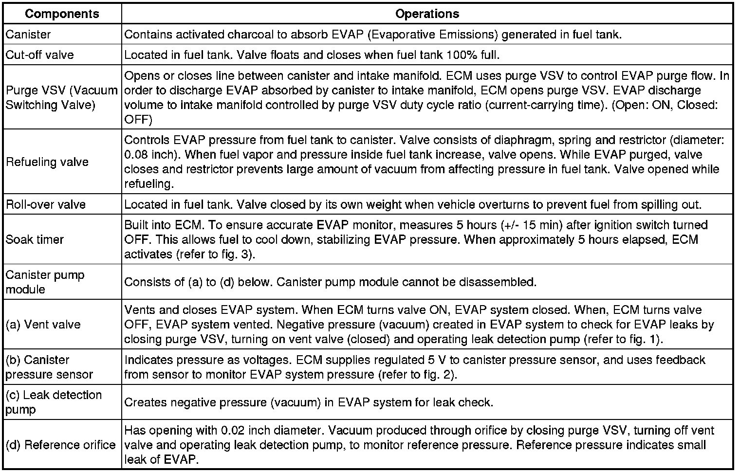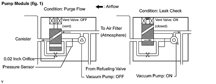 The leak detection pump creates negative pressure (vacuum) in the EVAP system and the pressure is measured. Finally, the ECM monitors for leaks from the EVAP system, and malfunctions in both the canister pump module and purge VSV, based on the EVAP pressure.