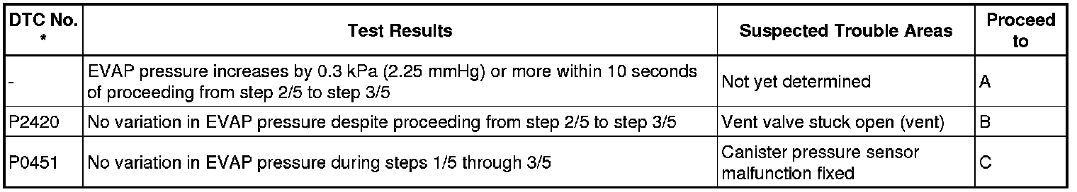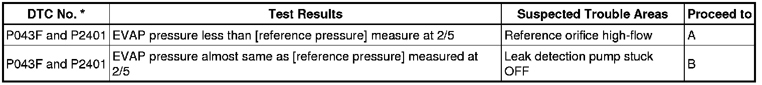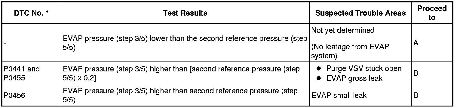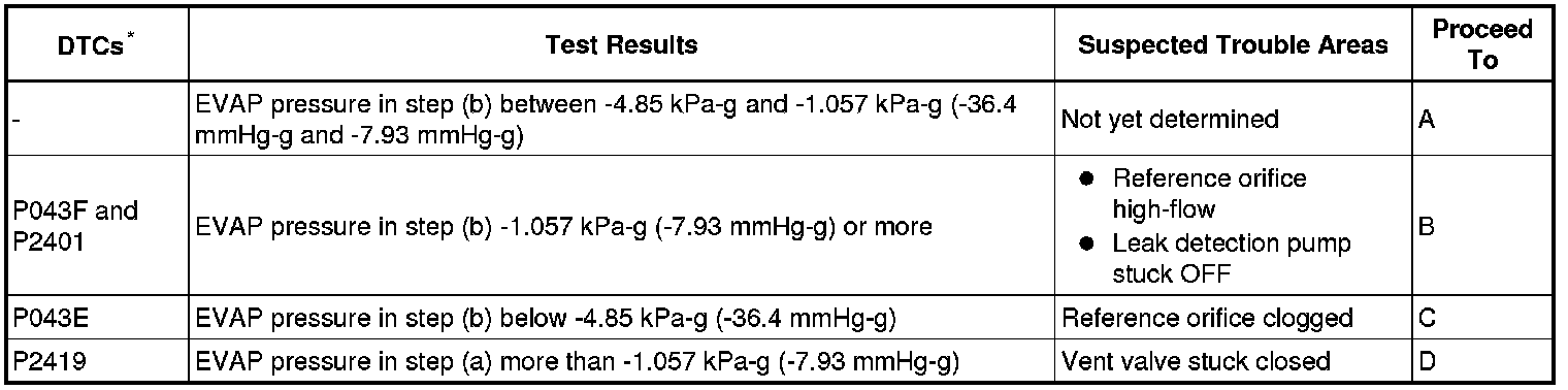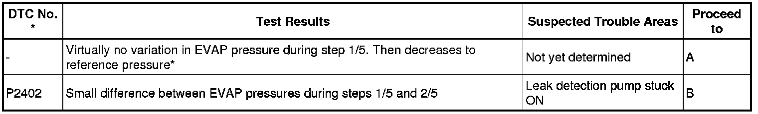 NOTE: If the 0.02 inch reference pressure difference between the first and second checks is greater than the specification, the DTCs corresponding to the reference pressure (P043E, P043F, P0441, P0455, P0456, P2401, P2420) will be all stored.
