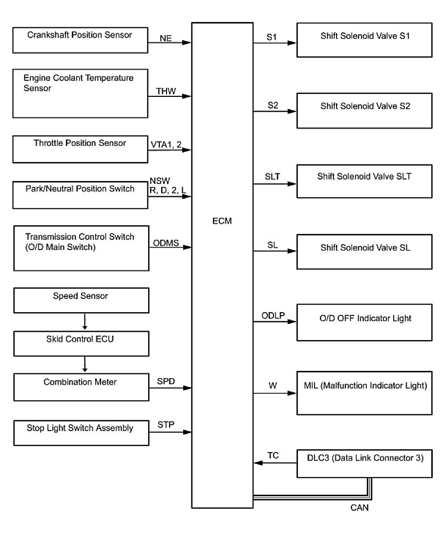 (a) The ECT (Electronic controlled automatic transmission/transaxle) is an automatic transmission/transaxle that electronically controls shift timing using the ECM. The ECM detects electrical signals that indicate engine and driving conditions, and controls the shift point, based on driver habits and road conditions. As a result, fuel efficiency and power transmission performance are improved.