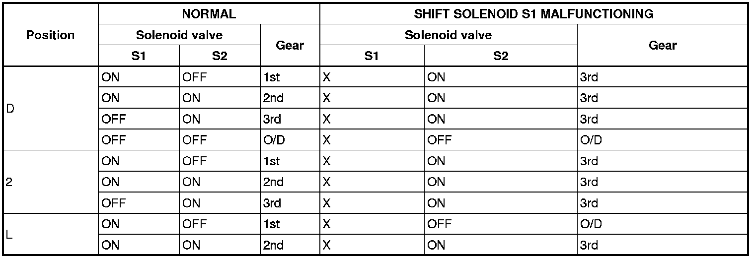 If either of the shift solenoid valve circuits develops an open or short, the ECM turns the other shift solenoid "ON" and "OFF" in order to shift into the gear positions shown in the table below.