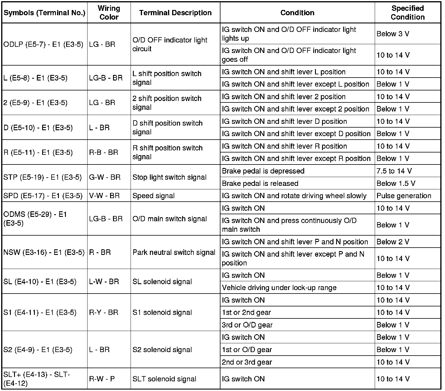 In the table, first follow the information under "Condition". Look under "Symbols (Terminal No.)" for the terminals to inspected. The standard voltage between the terminals is shown under "Specific Condition".