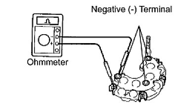 (2) Using an ohmmeter, measure the resistance between the negative (-) terminal and each rectifier terminal.