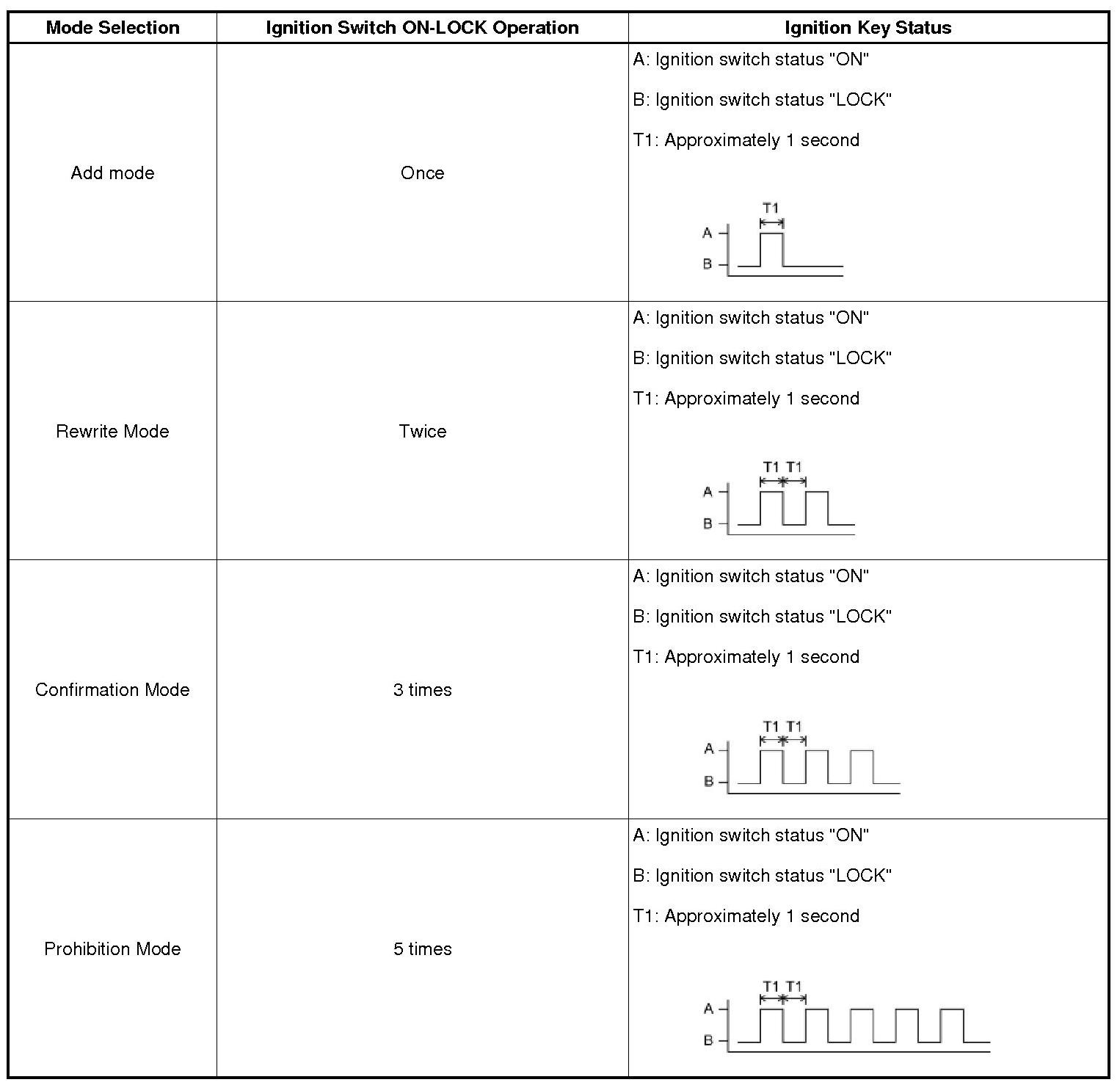 (h) Turn the ignition switch from LOCK to ON and back to LOCK at approximately 1 second intervals according to the number of times shown in the table below.