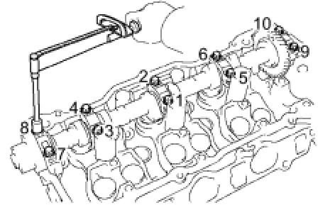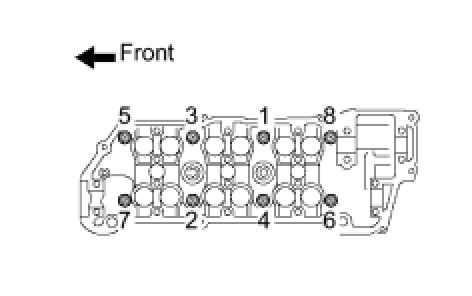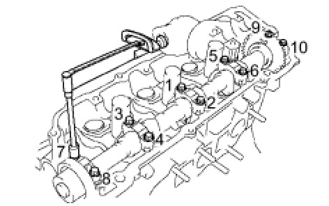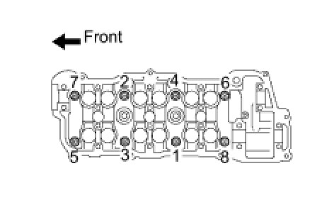 Uniformly install and tighten the 8 cylinder head bolts in the sequence shown in the illustration.