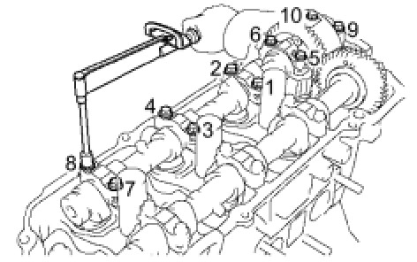 Uniformly tighten the 10 bearing cap bolts in the sequence show in the illustration.