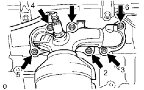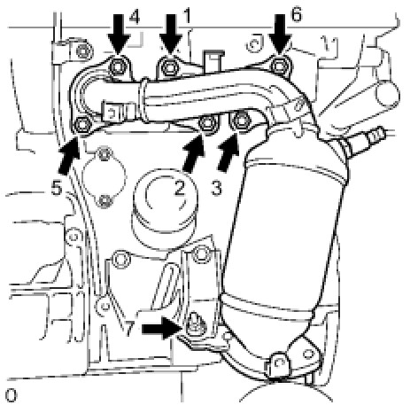 Install a new gasket and the converter with the 7 nuts. Uniformly, tighten the 7 nuts in the sequence shown in the illustration.
