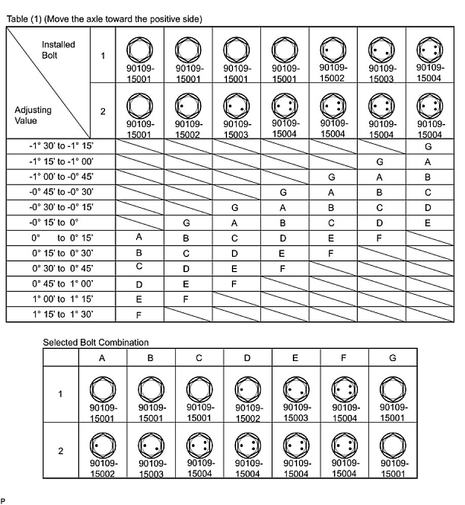 Check the combination of installed bolts. Select appropriate bolts from the table below to adjust the camber to within the specified range.