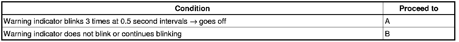 - If the warning indicator does not come on or comes on for more than 3 seconds, inspect and repair according to "PROBLEM SYMPTOMS TABLE" Symptom Related Diagnostic Procedures.