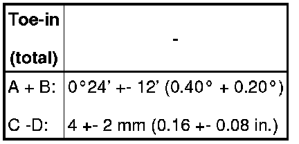 - If toe-in is not within the specified range, inspect the suspension parts and replace them if necessary.