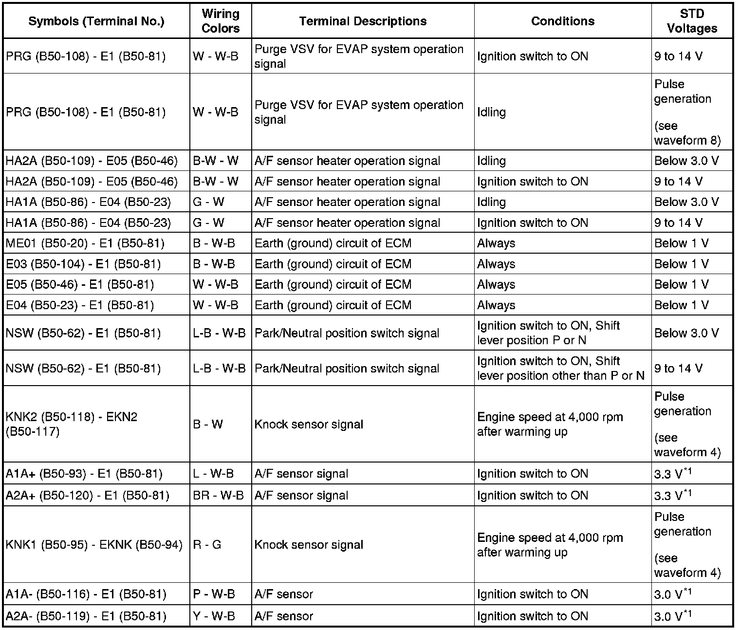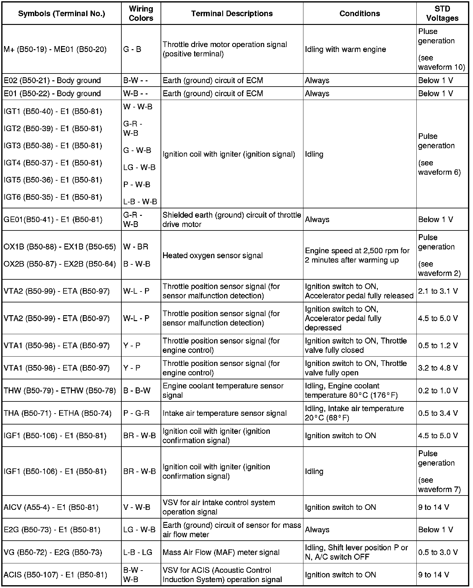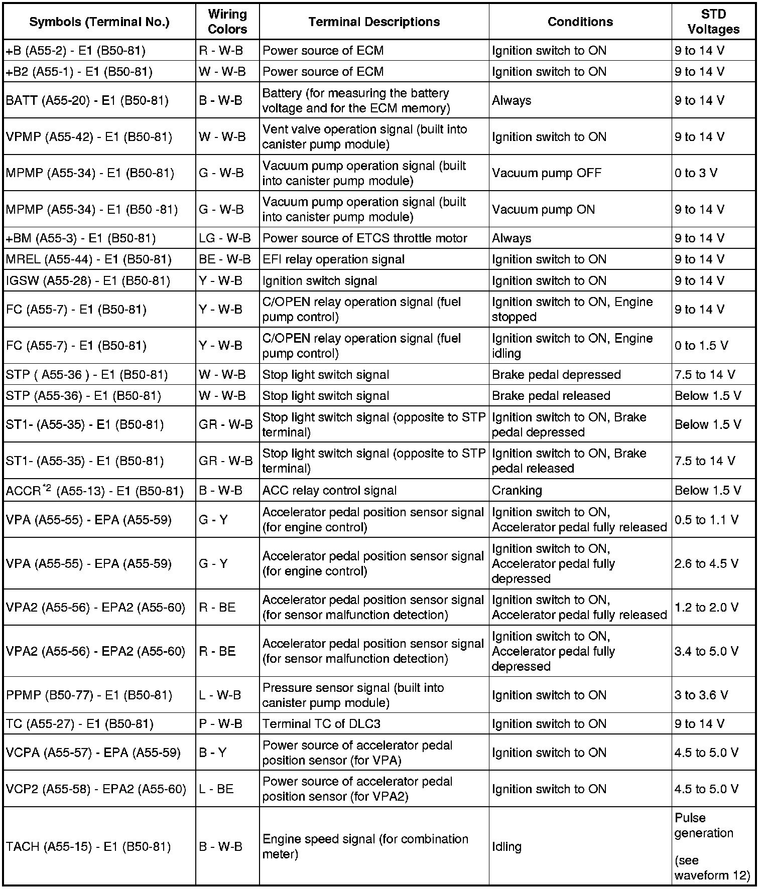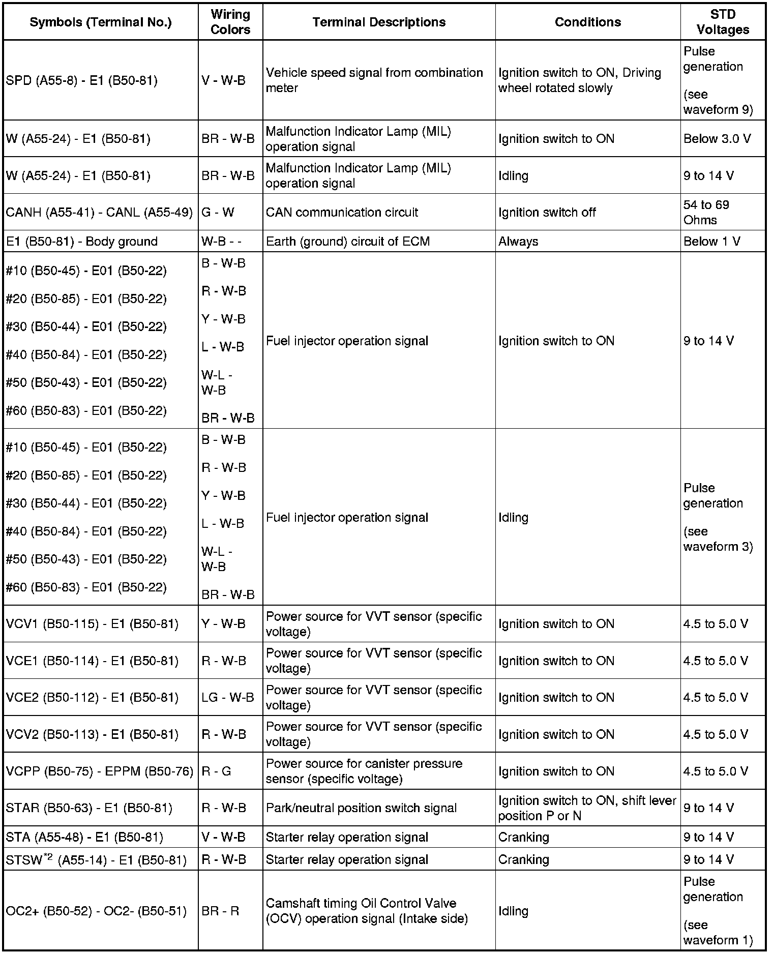 The standard normal voltage between each pair of the ECM terminals is shown in the table below. The appropriate conditions for checking each pair of the terminals are also indicated.