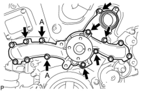 Install a new water pump gasket and the water pump assembly with the 16 bolts.