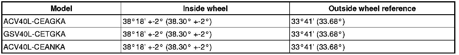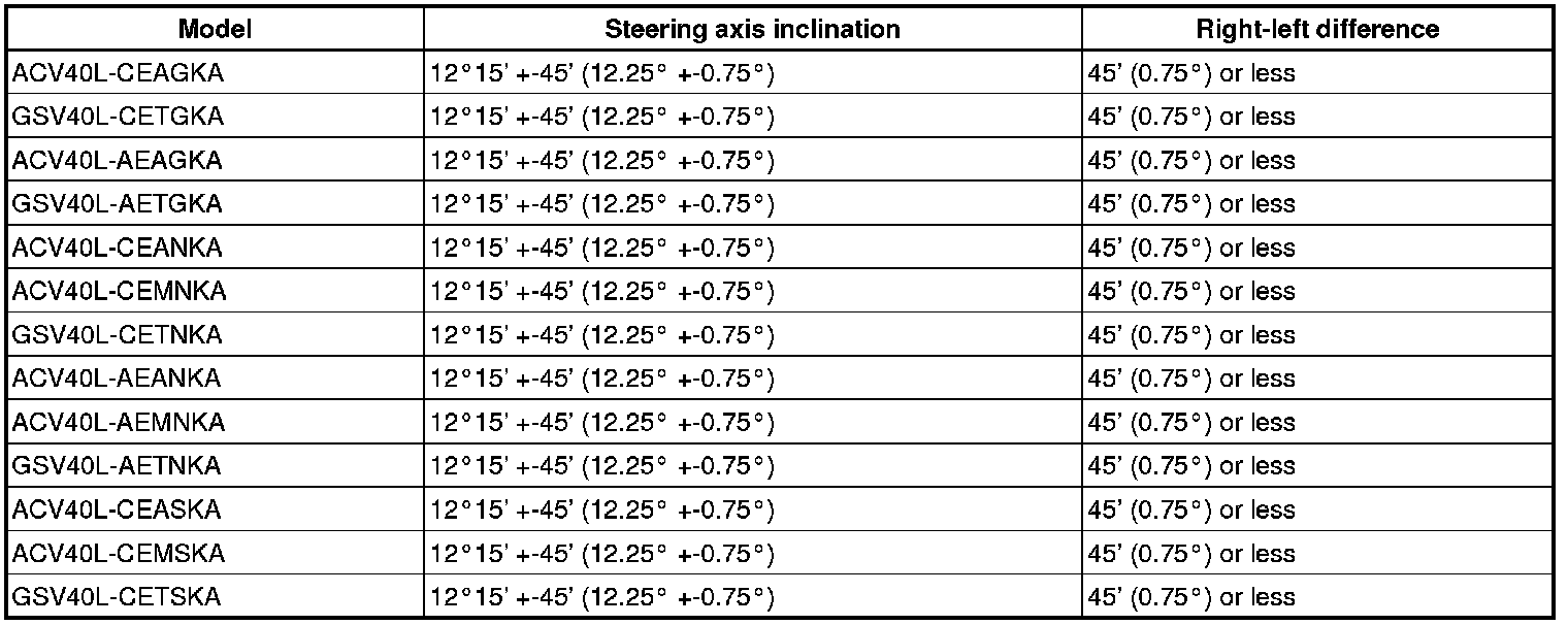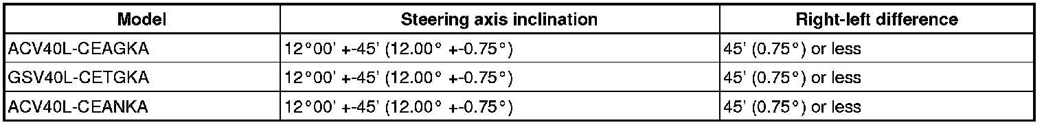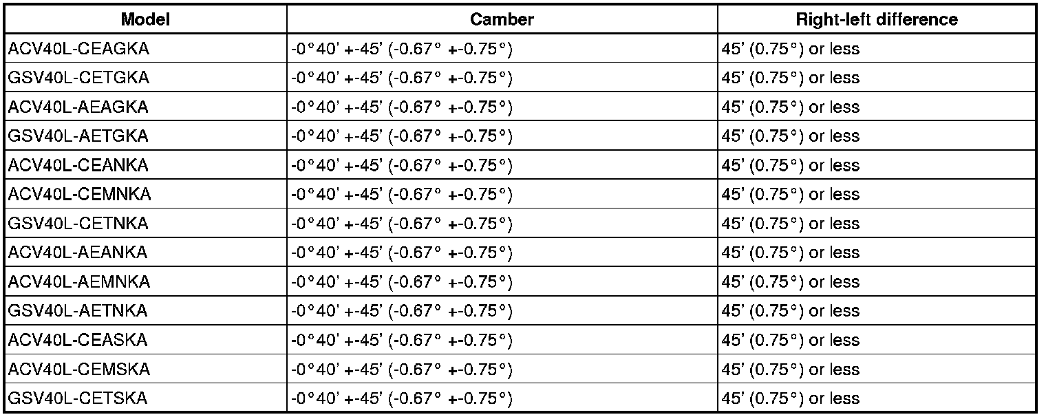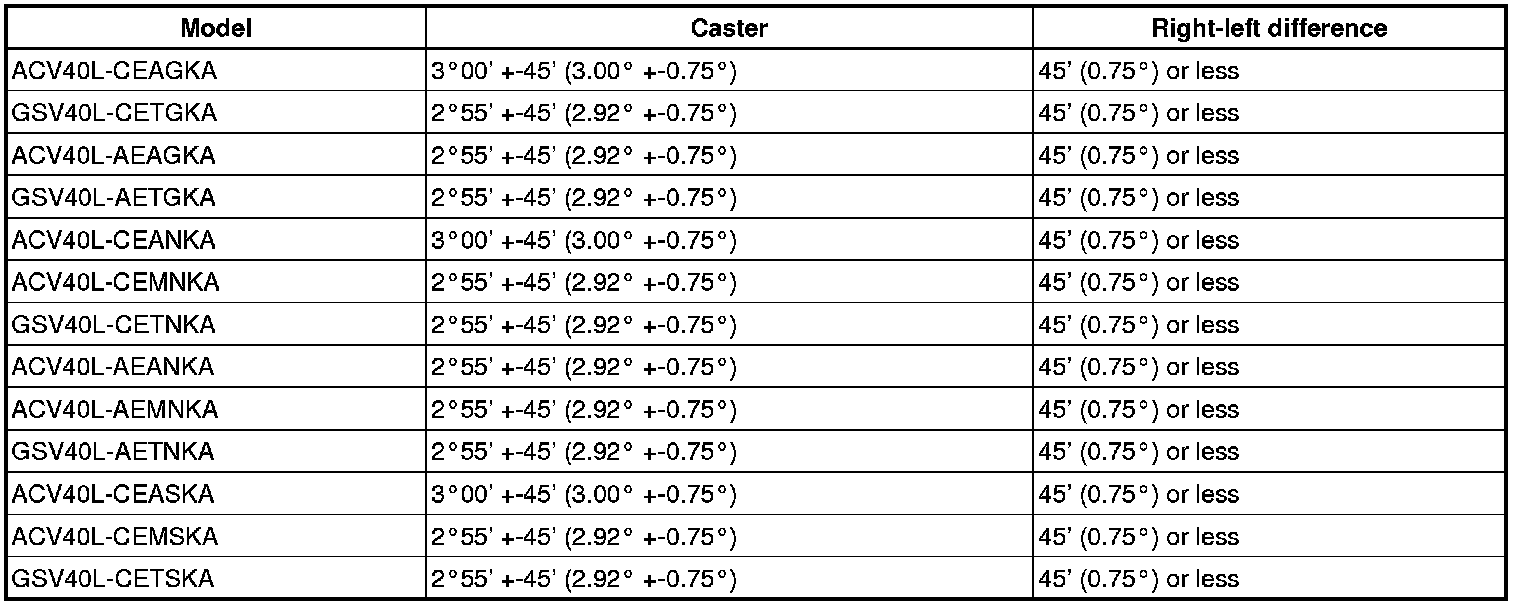 - The maximum tolerance of the right and left difference for the camber and caster is 45' (0.75°) or less.