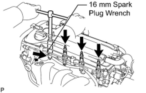 (3) Using a 16 mm (0.63 in.) spark plug wrench, remove the 4 spark plugs.