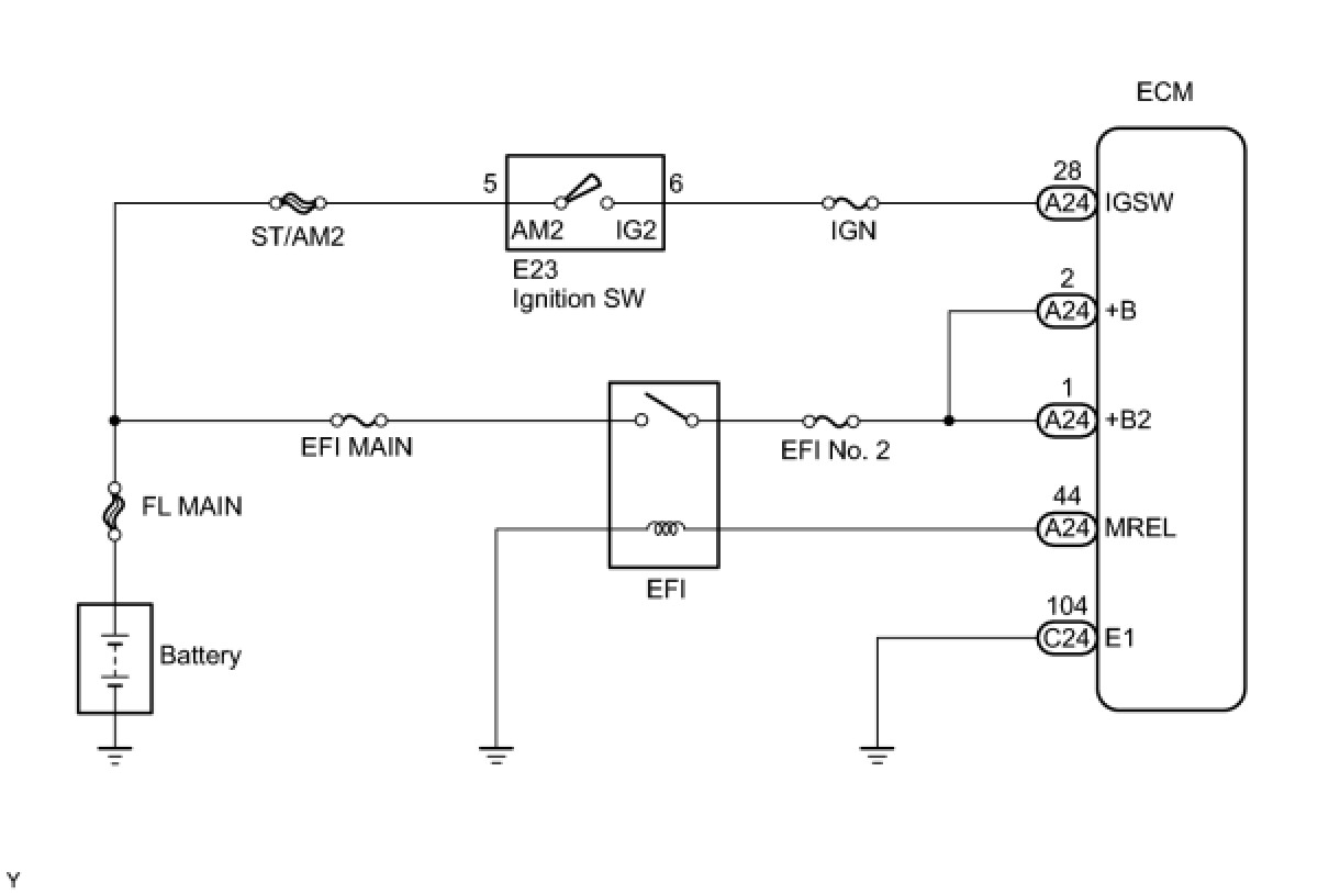 When the ignition switch is turned ON position, the battery voltage is applied to IGSW of the ECM. The output signal from the MREL terminal of the ECM causes a current to flow to the coil, closing the contacts of the engine room J/B (EFI relay) and supplying power to either terminal +B or +B2 of the ECM.