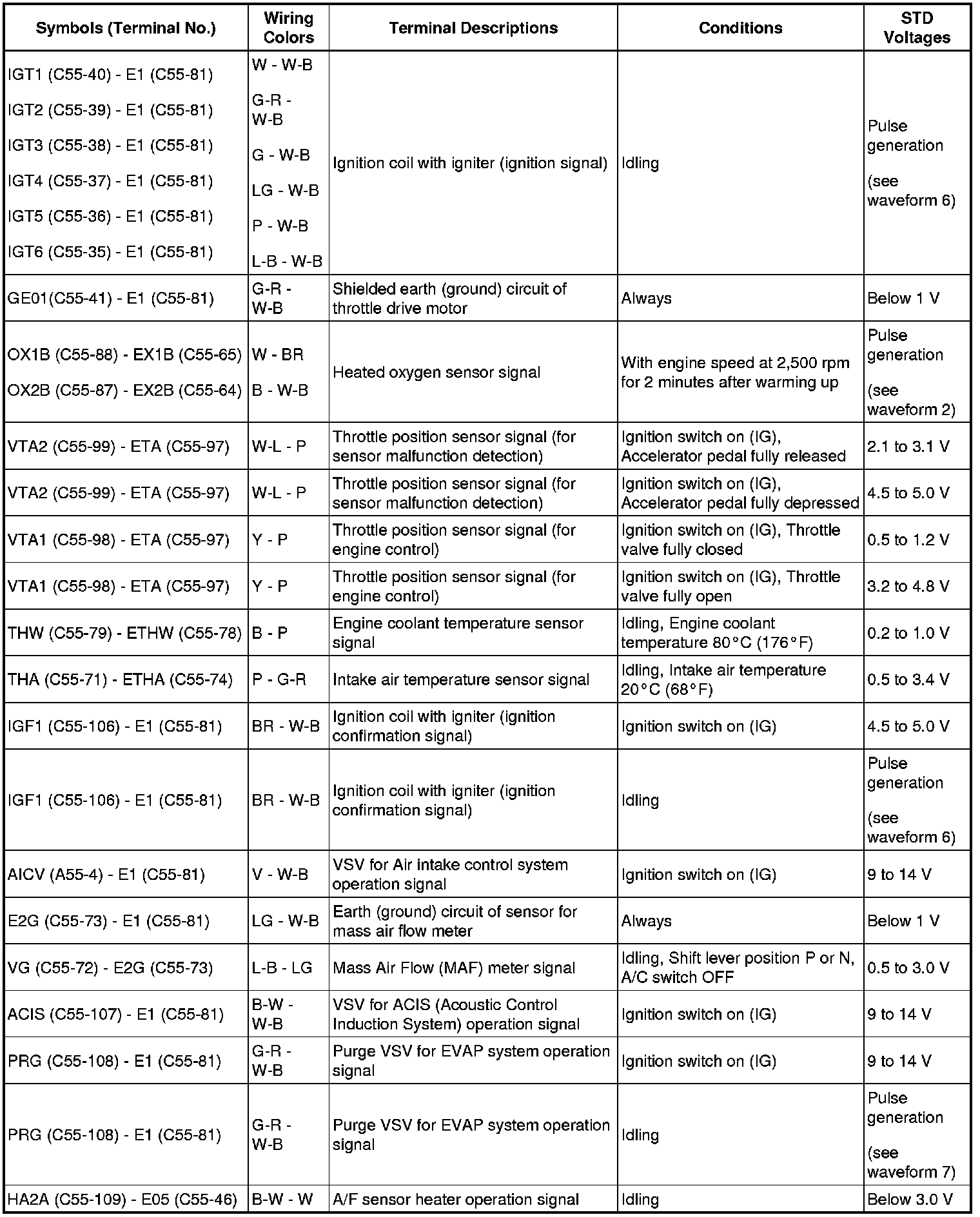 The standard normal voltage between each pair of the ECM terminals is shown in the table below. The appropriate conditions for checking each pair of the terminals are also indicated.