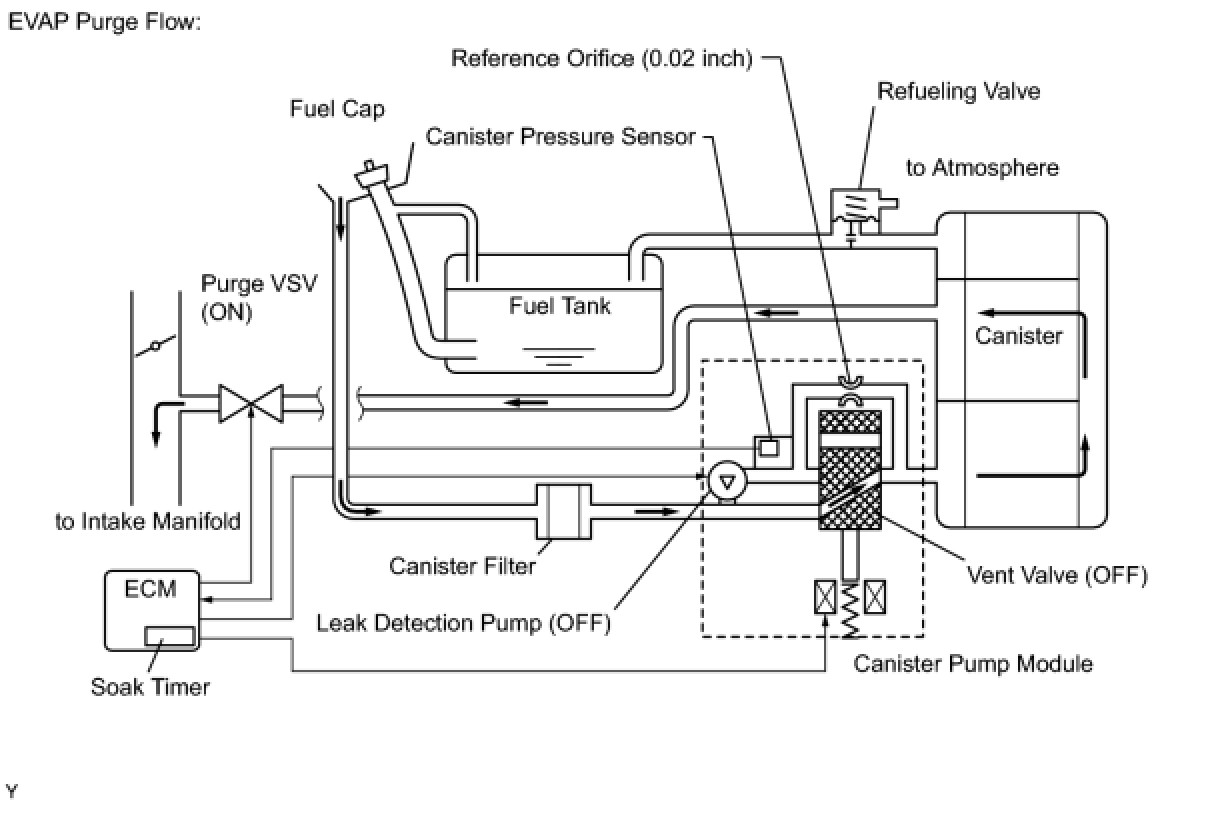 While the engine is running and the purge VSV (Vacuum Switching Valve) is ON (open), the ECM monitors the purge flow by measuring the EVAP pressure change. If negative pressure is not created, the ECM begins the 2nd monitor.