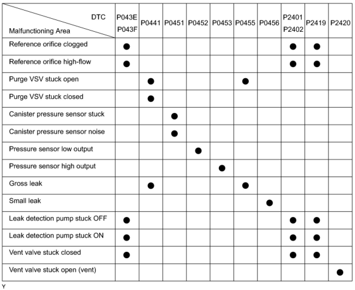 If any EVAP system DTCs are set, the malfunctioning area can be determined using the table below.